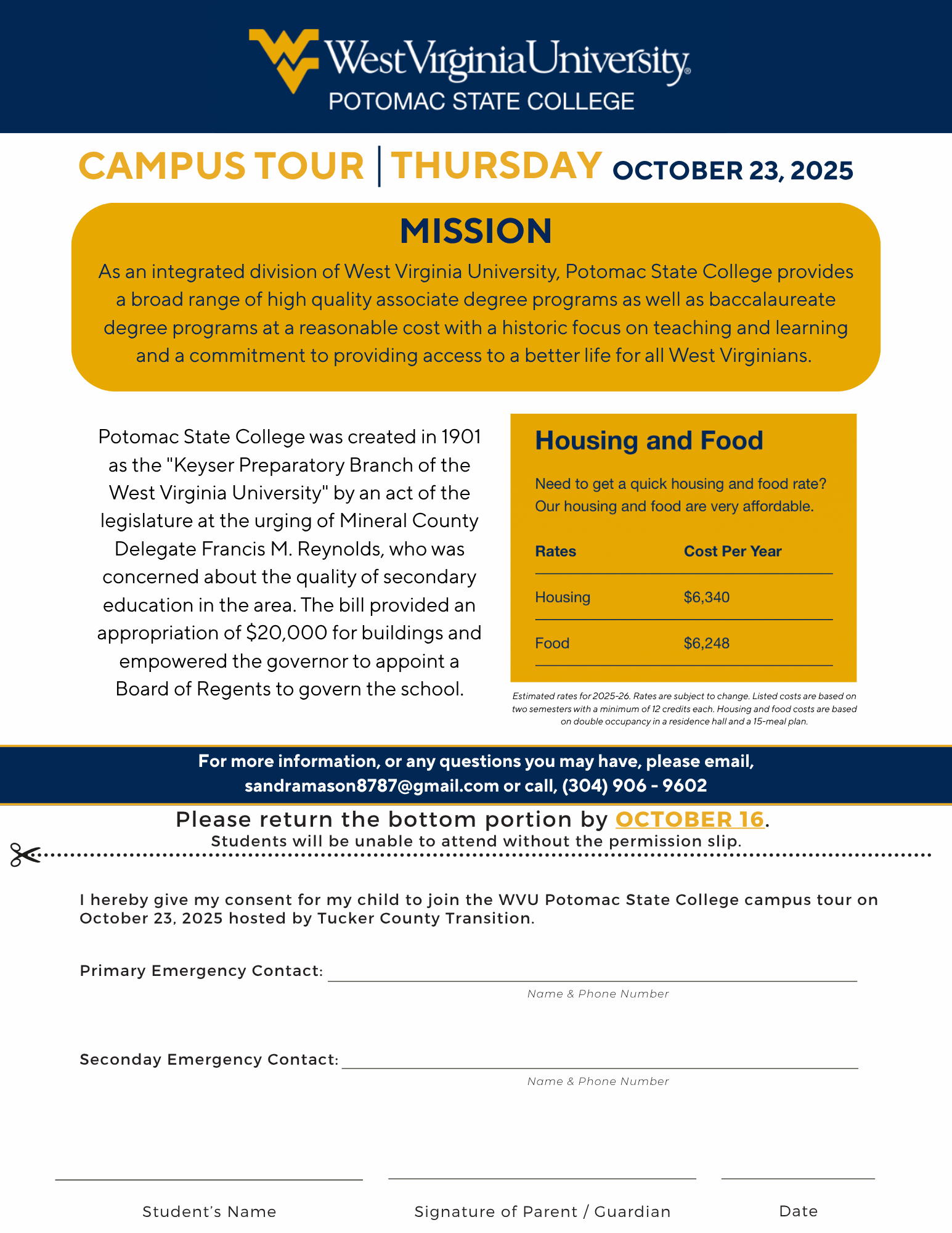Back to All Events Potomac State College Campus Tour Thursday, October 23, 2025 8:00 AM 3:00 PM Google Calendar ICS
